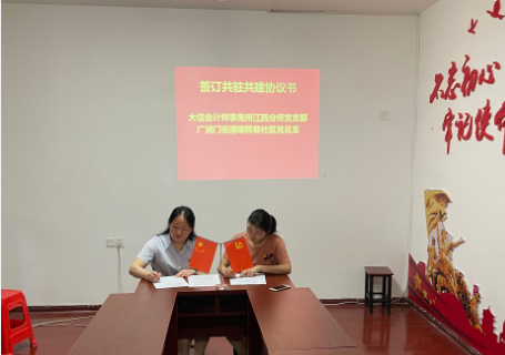 在座谈会上,江西分所党支部书记冯丽娟与烟筒巷社区党支部书记杜淑敏在基层党组织共建问题上达成共识,现场签订《基层党建共驻共建协议书》。冯丽娟提出,今后党支部的工作不仅要放在社区困难群众的物质帮扶上,还要利用事务所自身的专业优势,为社区及社区内企业提供优质的审计、评估和工程造价等咨询服务。同时也希望社区可以关注社区内优秀适龄的相关专业大学毕业生情况,向会计师事务所积极推荐人才。