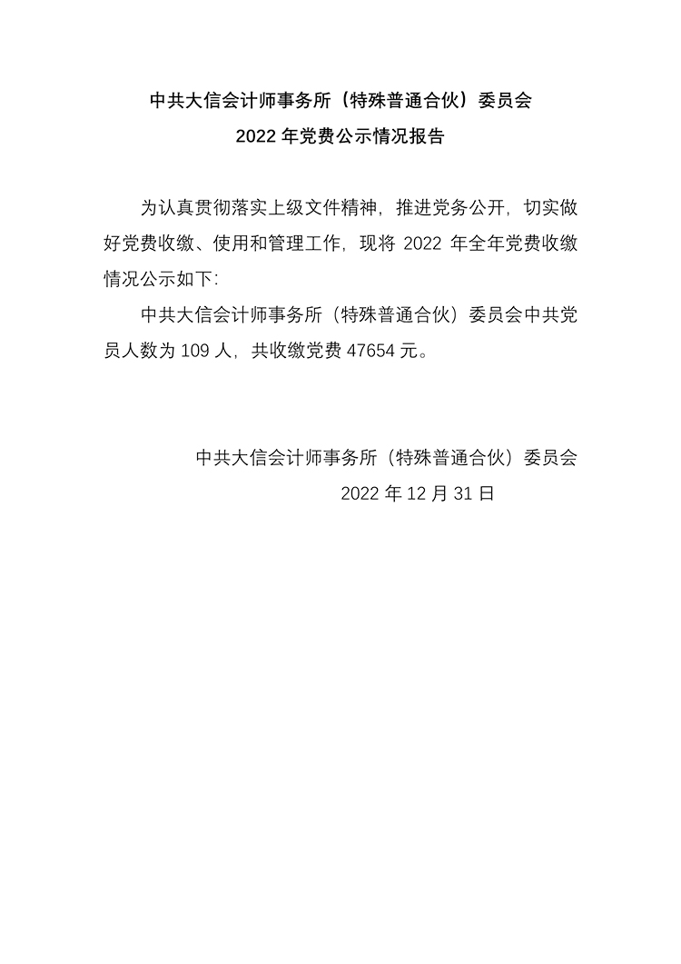 关于中共大信会计师事务所(特殊普通合伙)委员会2022年党费收缴情况的公示