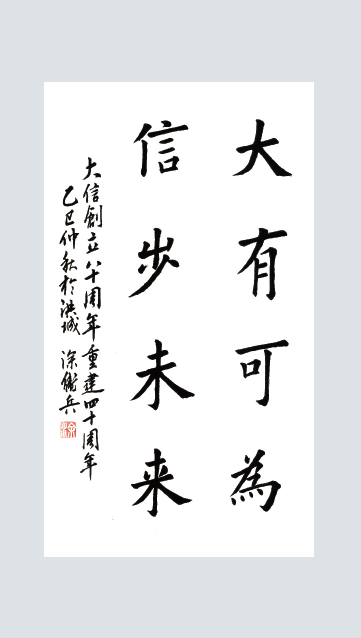 作品释义: 值此大信创立80周年重建40周年之际,以笔墨为载体,对大信的情感与信念跃于纸上。心里满是对大信80年坚守“以信立业”的敬意,从创立到重建,这份“信”是扎根行业的根本,也是我们始终恪守的准则。而“大有可为 信步未来”,既是大信重建四十载在专业领域深耕、服务行业发展的担当,更是对未来的期许。八十载风华,“信”启新程。