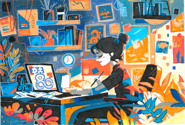 《账册里的星辰灯火》使用油画棒及水粉笔创作,灵感来自于审计人日常的工作状态,致敬审计工作者不分昼夜的辛勤付出与专业精神。不仅仅是工作的一个瞬间,更是这份职业背后所承载的责任、专注与坚守。