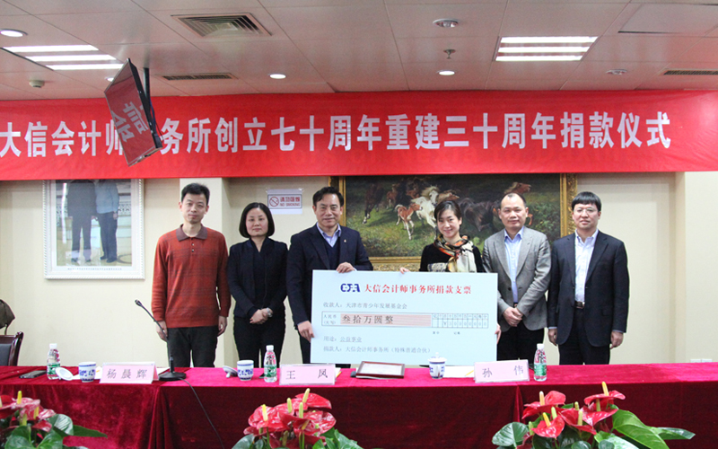2016年1月27日,“大信会计师事务所创立七十周年重建三十周年捐款仪式”在北京大信总部举行。捐款仪式上,大信会计师事务所党委副书记代表全体合伙人向天津市青少年发展基金会捐赠善款30万元,用于关爱青少年健康成长,开展相关公益项目。
