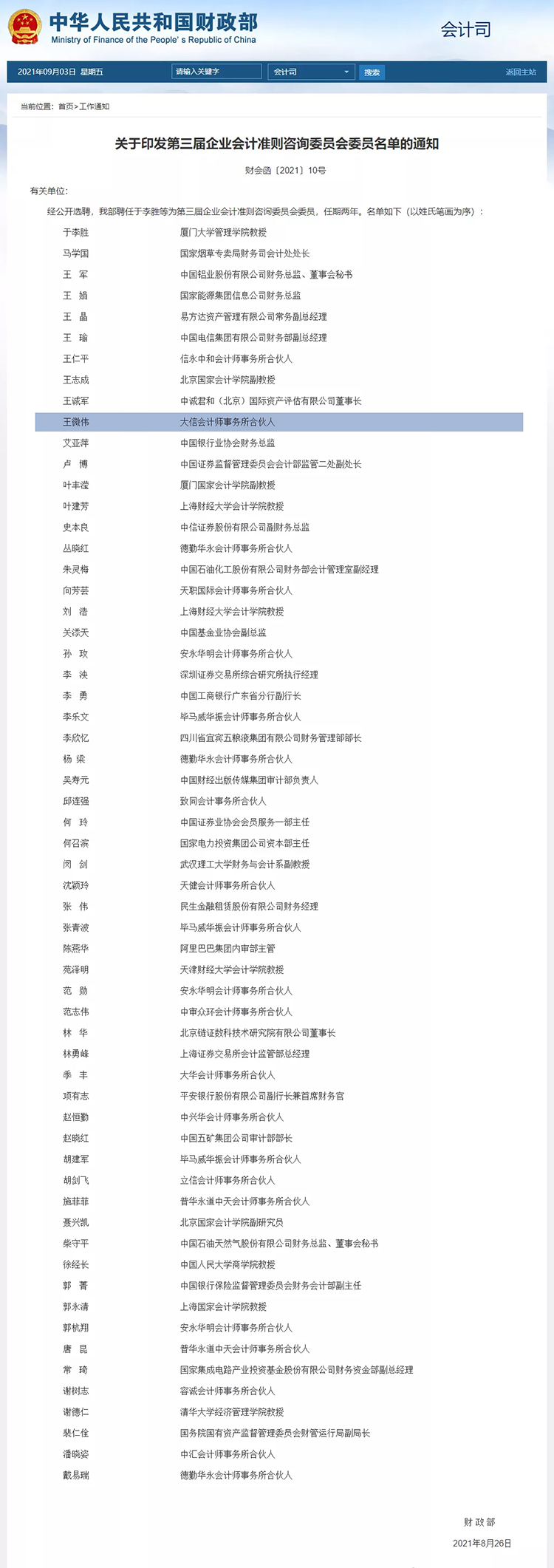9月2日,财政部公布第三届企业会计准则咨询委员会委员名单,大信会计师事务所合伙人王微伟在内的60名专家入选第三届企业会计准则咨询委员会咨询委员,任期两年。