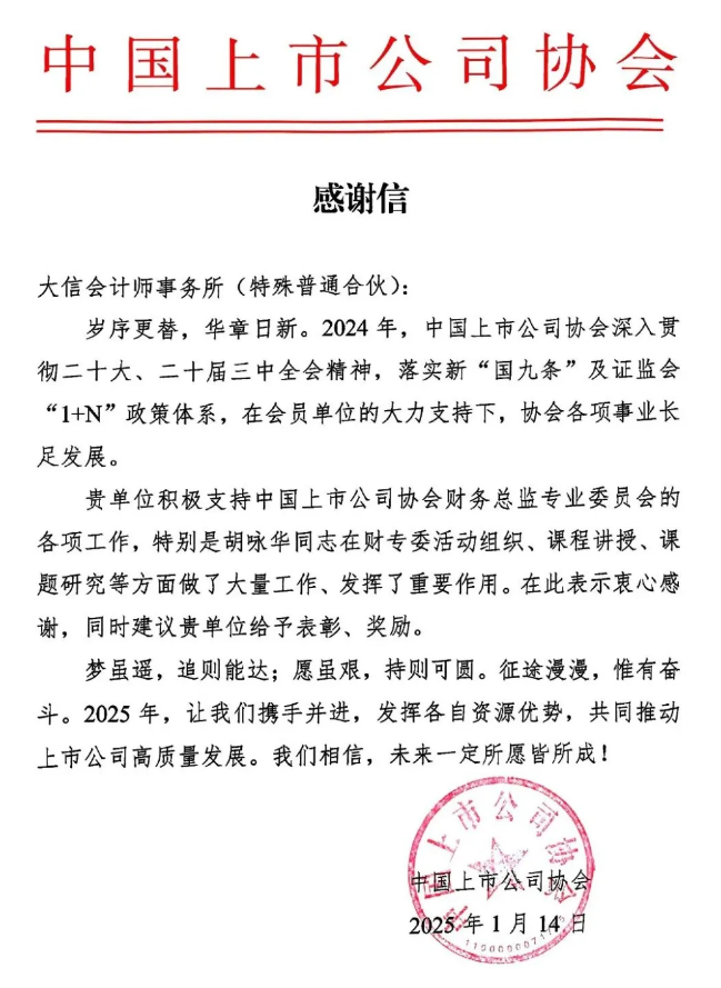 中国上市公司协会在感谢信中表示,大信积极支持中国上市公司协会财务总监专业委员会的各项工作,特别是胡咏华同志在财专委活动组织、课程讲授、课题研究等方面做了大量工作、发挥了重要作用。对此表示衷心感谢,同时建议大信给予表彰、奖励。