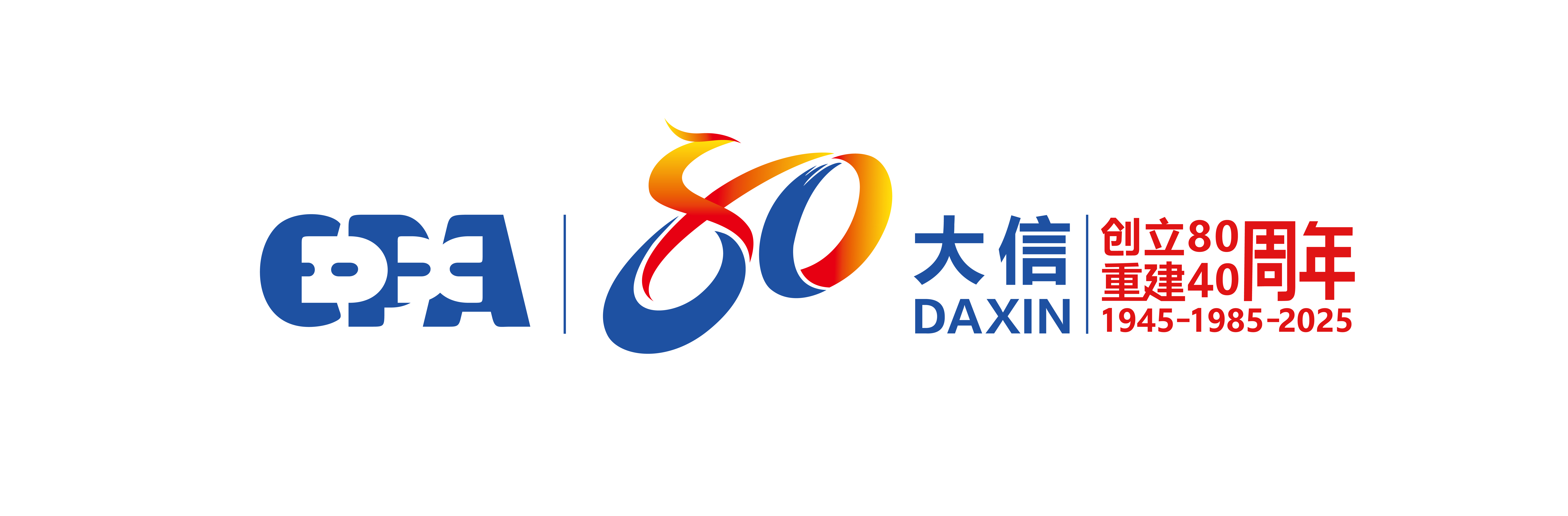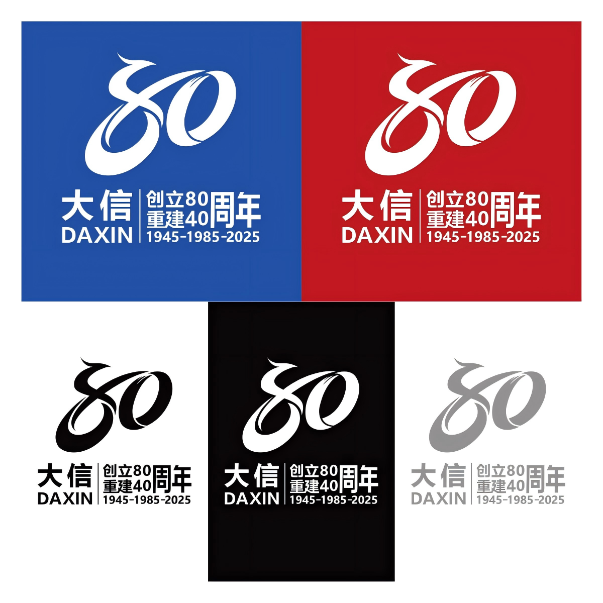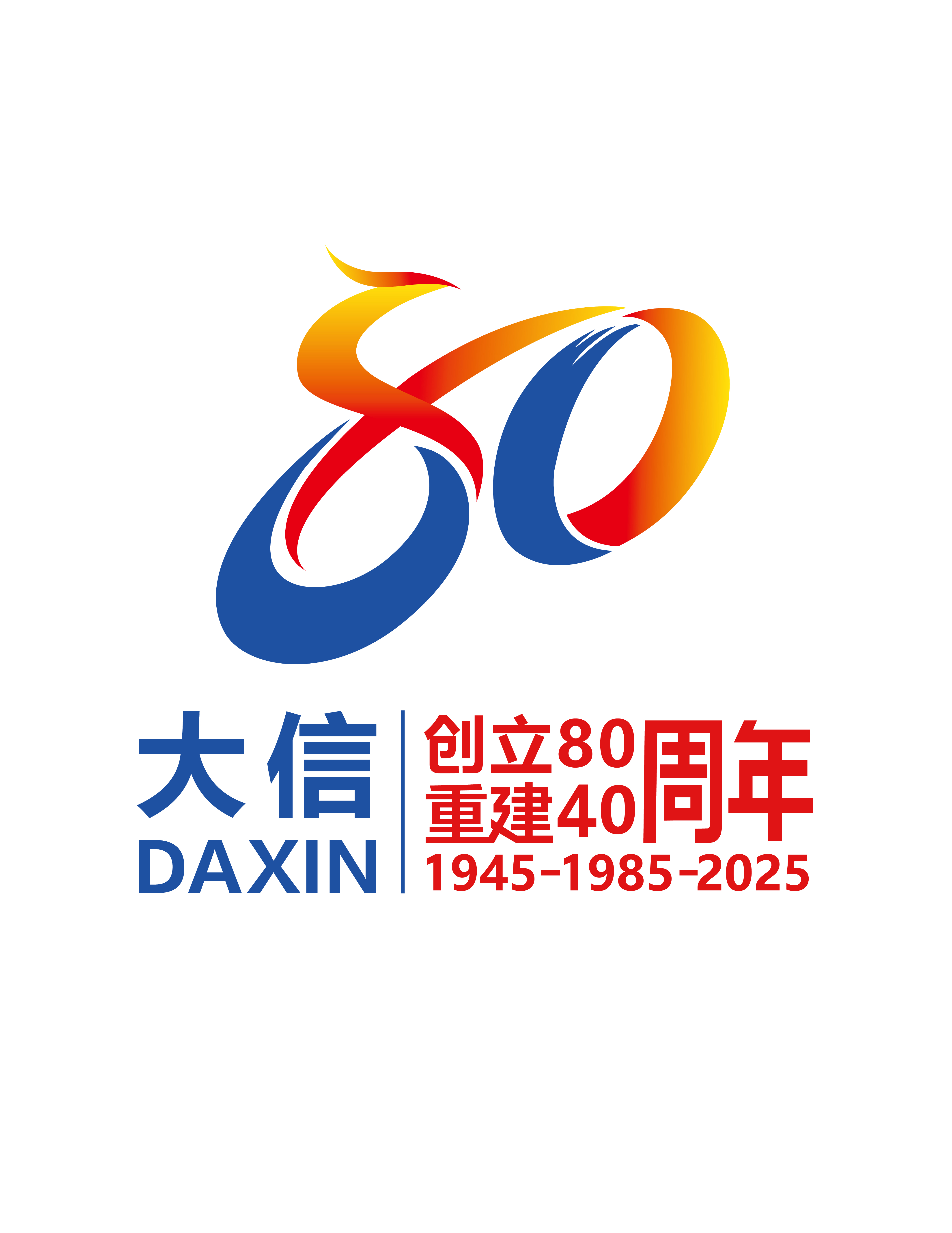 标识由凤凰,数字“80、40”,大信首字母缩写“DX”,文字大信DAXIN、创立80重建40周年,时间“1945—1985—2025”构成。