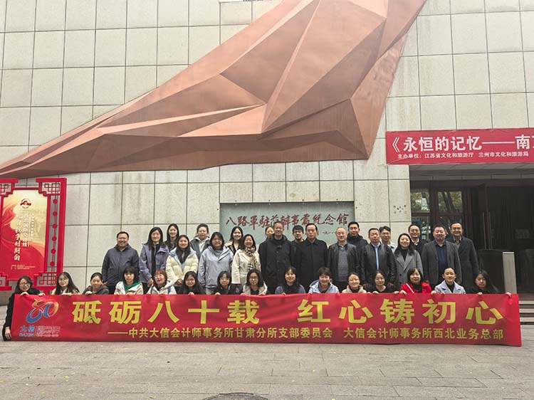 值此大信会计师事务所(特殊普通合伙)喜迎创立80周年重建40周年的重要节点,为传承红色基因、凝聚奋进力量,西北业务总部于11月11日组织员工赴八路军驻兰州办事处红色基地,开展“砥砺八十载红心铸初心”主题学习活动,以实际行动践行大信初心使命,同时致敬大信80载辉煌历程。