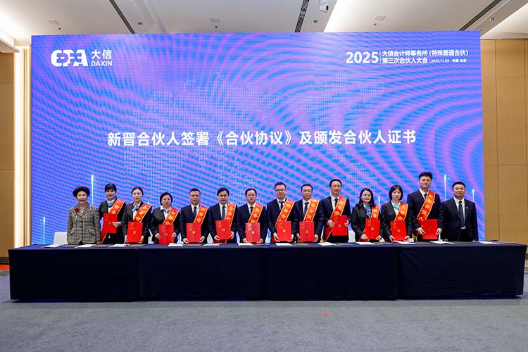 大会举行了新晋合伙人入伙仪式。他们在会上正式签署《合伙协议》,并举行了颁发证书和宣誓仪式。24位优秀合伙人的加入,为大信发展注入了活力和新鲜血液,为事务所高质量发展再添助力。