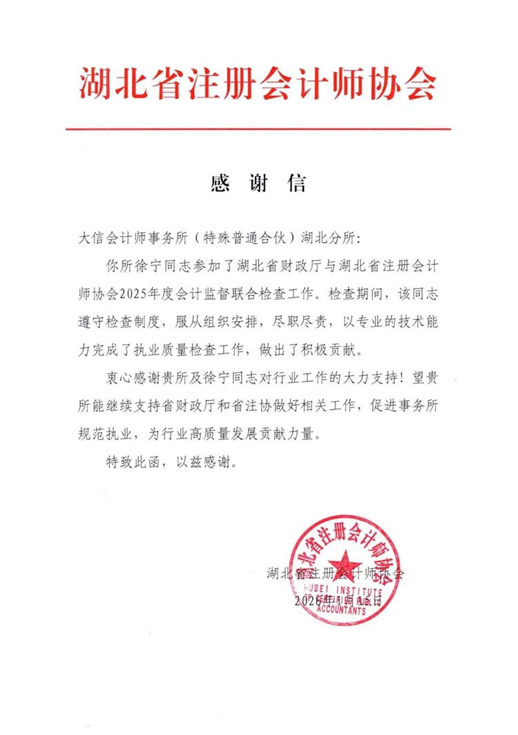 在湖北省财政厅与湖北省注册会计师协会2025年度会计监督联合检查工作期间,徐宁同志遵守检查制度,服从组织安排,尽职尽责,以专业的技术能力完成了执业质量检查工作,做出了积极贡献;在会计师事务所执业质量检查工作中,张体梅、杨鹏同志展现了同样的专业素养。湖北省注册会计师协会最后表示,希望大信继续支持相关工作,促进事务所规范执业,为行业高质量发展贡献力量。