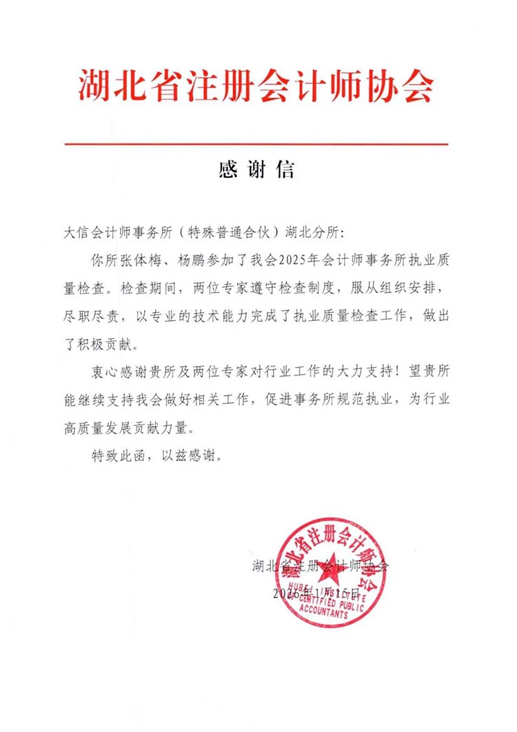 近日,大信收到两封来自湖北省注册会计师协会的感谢信,对我所湖北业务总部徐宁、张体梅、杨鹏同志在参与湖北省执业质量检查工作中做出的积极贡献表示衷心感谢。