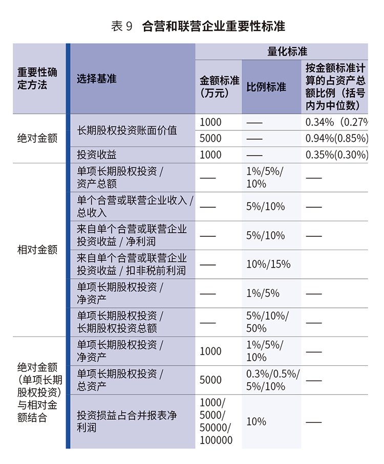 (2)组合量化标准。重要性组合标准多应用于非财务报表具体项目,有的采用单一标准,但多数采用了组合标准。例如,重要非全资子公司、重要的合营和联营企业,采用资产总额、净资产、收入、利润,或该等指标组合确定重要性。非财务报表项目重要性标准也呈现出差异化,如重要的非全资子公司,无论是以收入、净利润,还是净资产为选择基准,采用比例有 5%、10%、15% 等。